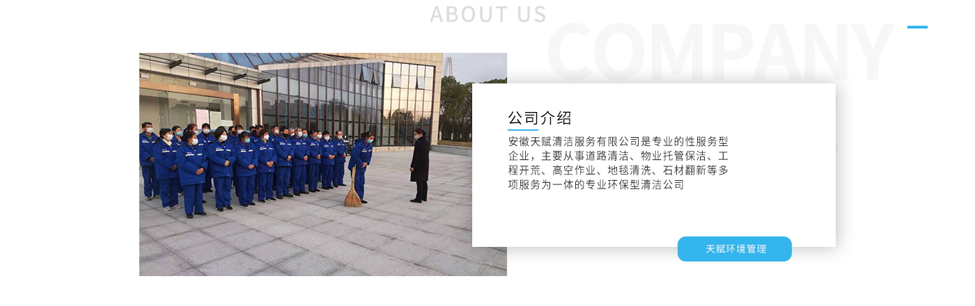 安徽天賦清潔服務(wù)有限公司是的服務(wù)型企業(yè),主要從事道路清潔、物業(yè)托管保潔、工程開(kāi)荒、高空作業(yè)、地毯清洗、石材翻新等多項(xiàng)服務(wù)為一體的環(huán)保型清潔公司。公司管理機(jī)制完善,清潔作業(yè)經(jīng)驗(yàn)豐富,擁有技術(shù)力量,嚴(yán)格實(shí)行崗前培訓(xùn)—崗中督查—上崗在培訓(xùn)的員工管理措施,憑著優(yōu)良的清潔質(zhì)量和嚴(yán)格的督查管理,為眾多企事業(yè)單位、醫(yī)院、酒店、廠(chǎng)區(qū)商場(chǎng)、物業(yè)、道路、學(xué)校、公園等提供后勤清潔服務(wù)。在業(yè)內(nèi)擁有良好的口碑。工作人員,服務(wù)態(tài)度優(yōu),竭力為客戶(hù)提供好的保潔服務(wù)。安徽天賦清潔服務(wù)有限公司:致力于長(zhǎng)期合作關(guān)系,提高服務(wù)質(zhì)量,提供高標(biāo)準(zhǔn)的清潔服務(wù)。公司的經(jīng)營(yíng)理念:為營(yíng)造一個(gè)更清潔、亮麗的生活和工作環(huán)境而努力!“誠(chéng)信”是公司成功保證。“客戶(hù)至上,信譽(yù)為首”是公司宗旨。高標(biāo)準(zhǔn)提供服務(wù),維護(hù)客戶(hù)利益、形象,是我始終不渝的目標(biāo)。